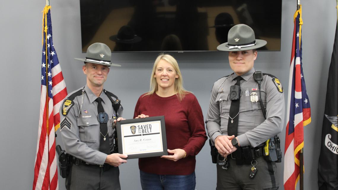 The Ohio State Highway Patrol gave Amy Craun the award for avoiding life-threatening injuries in a crash last month because she wore her safety belt.
