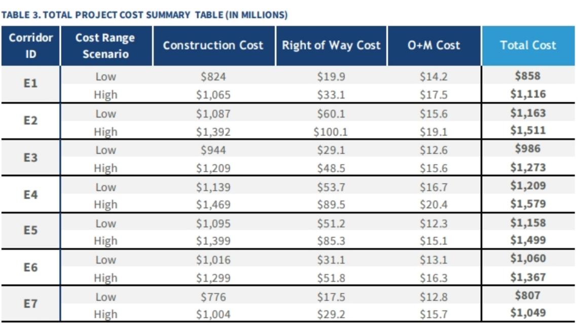 Building this connector could cost anywhere between $858 million to $1.579 billion, depending on the route that is selected.