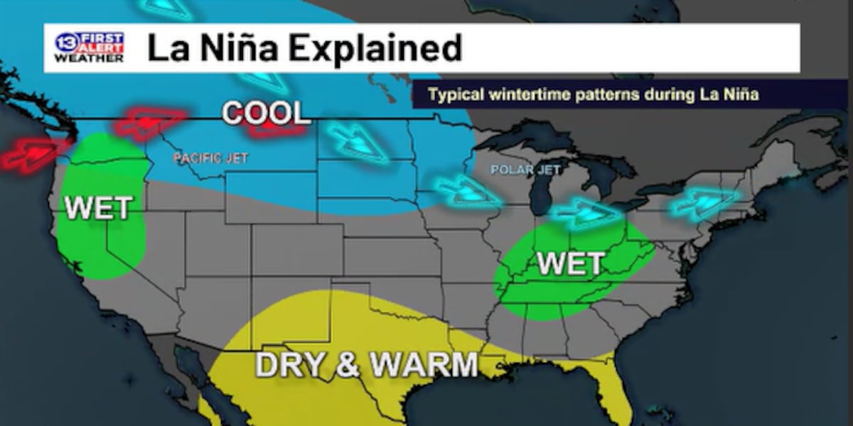La Niña is a climate pattern that happens when these trade winds are more intense. They push more warm water, allowing more cold water to rise to the surface. These cold waters push the jet stream northward. This tends to bring warmer and drier conditions to the southern U.S. and cooler, wetter conditions to the north.