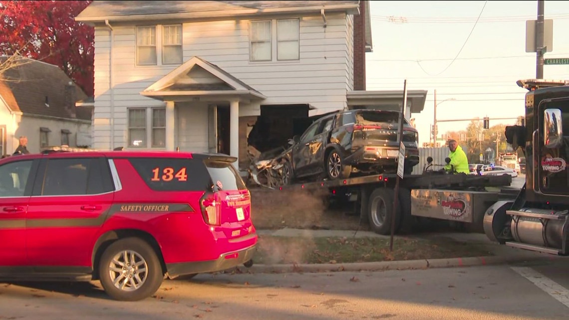 Police at the scene said the driver lost control of the car and hit a curb, a fire hydrant and another car before landing inside the home on Charlestown Avenue.
