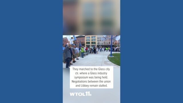 Striking Libbey Glass workers march to Glass City Center in downtown Toledo
