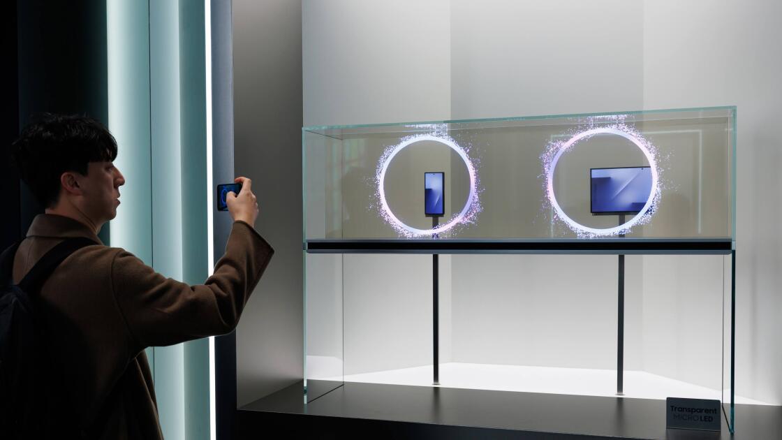It opens up to a 10-inch screen when needed, and folds back into a rather chunky smartphone when not in use. At least that’s what an on-screen animation shows. No one actually saw it in action at the K-Tech showcase in South Korea. Instead, Samsung had two of the devices side by side behind glass, one folded and one open completely. A video clip superimposed on the glass then showed the device flipping between three form factors.