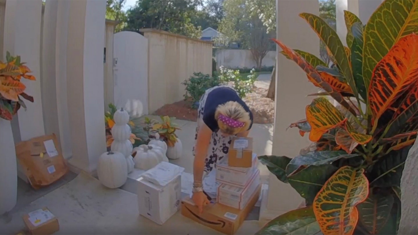 Home security video shows Todd Bond allegedly stealing packages from the front porch of a house, while dressed as a woman, in Mobile, Alabama. (Mobile County Sheriff’s Office)