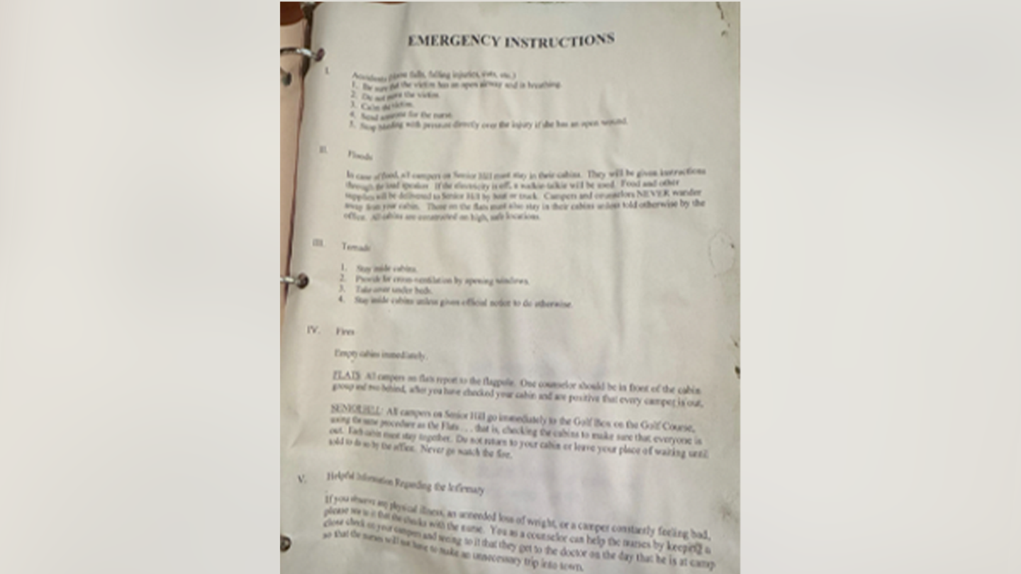 The lawsuit includes a one-page “Emergency Instructions” sheet that told campers to stay inside during floods and stated, “All cabins are constructed on high, safe ground.” Families call this guidance “false and dangerous.” The document was allegedly recovered from a counselor’s trunk after the flood.